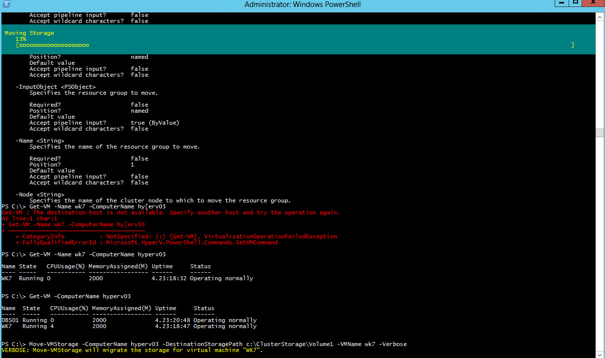 PS C:\> Move-VMStorage -ComputerName hyperv03 -DestinationStoragePath c:\ClusterStorage\Volume1 -VMName wk7 -Verbose