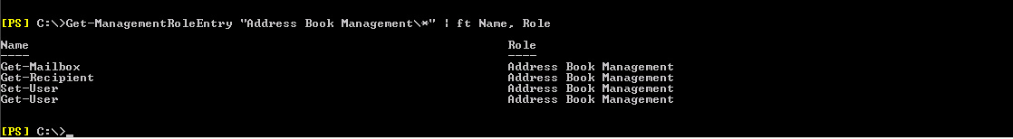 1) C:\>Get-ManagementRoleEntry -Identity “Address Book Management\*” | ?{$_.Name -ne “Get-User”} | Remove-ManagementRoleEntry ( This command removes all available cmdlets from this Role except the ‘Get-User’ cmdlet.