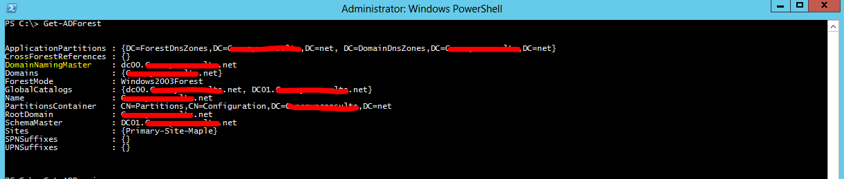 The Get-ADDomain and Get-ADForest cmdlets helped me identify what roles needed to be seized from the failed Domain Controller DC00. After identifying the Operation Master roles, I used the Move-ADDirectoryServerOperationMasterRole cmdlet, with the Force parameter to actually seize and move the roles to the target Domain Controller DC01: