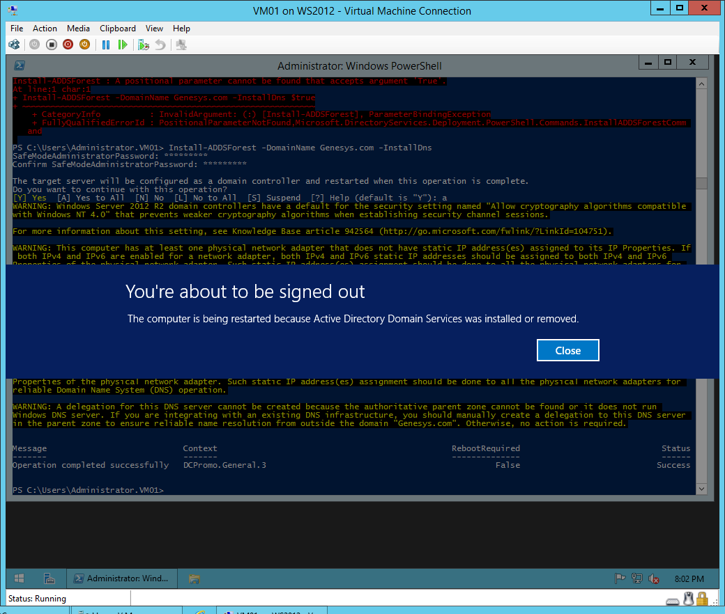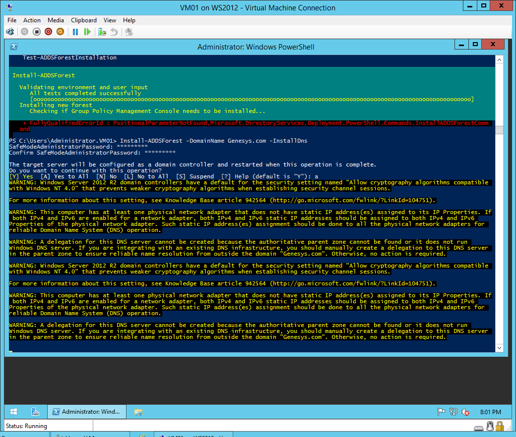To start the Active Directory installation, I used the Install-ADDSForest cmdlet with the required Domainname parameter and the InstallDns parameter. You will be prompted for the SafeModeAdministratorPassword and confirmation for the install to continue: