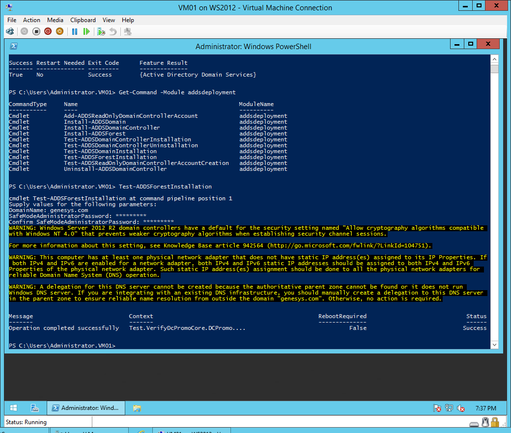 Running the Test-ADDSForestInstallation cmdlet spares me the headache of a failure during AD installation. The results gives me an indication of issues I might need to be aware of and resolve before continuing the installation process as shown in the next screenshot: