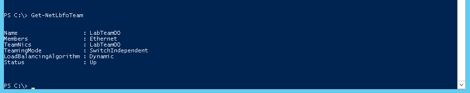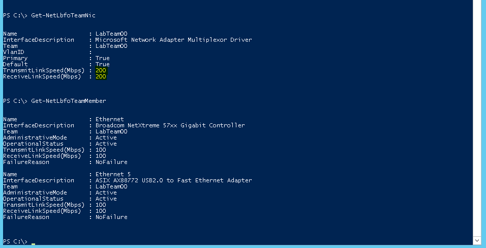 The screen shot above, shows how the NIC Team status changes from “Physical Media Disconnected” to “Degraded” to Up after a few seconds of adding a second NIC to the NIC Team. Using the Get-NetlbfoTeamNic cmdlet displays the new values for the Recieve and Transmit link speed as an aggregate of both network adapters’ link speed.
