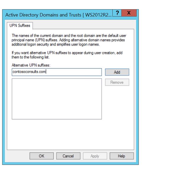 Enter the required alternative UPN suffix as indicated below, click Add and Ok: