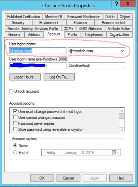 As part of the Office 365 Configuration and migration project, we’ve had to define and create an alternate upn (UserPrincipalName) suffix for an internal Active Directory domain that is not publicly routable. Updating the upn for every user in the Active Directory Domain could be a tedious task if done manually. Following is a screen shot of a user object upn before the script run:
