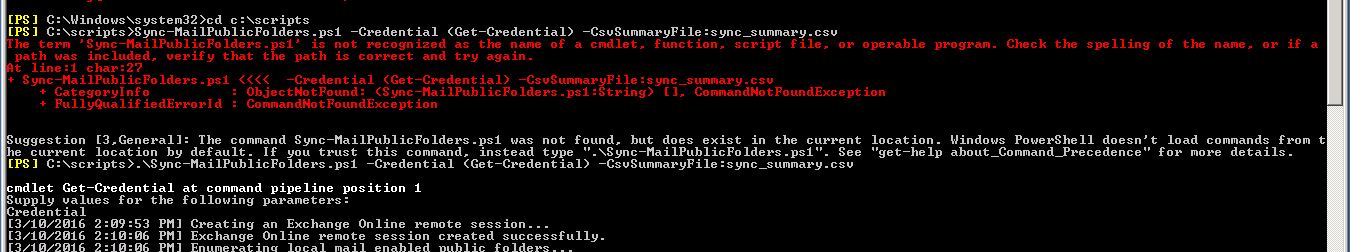 Sync-MailPublicFolders.ps1 -Credential (Get-Credential) -CsvSummaryFile:sync_summary.csv