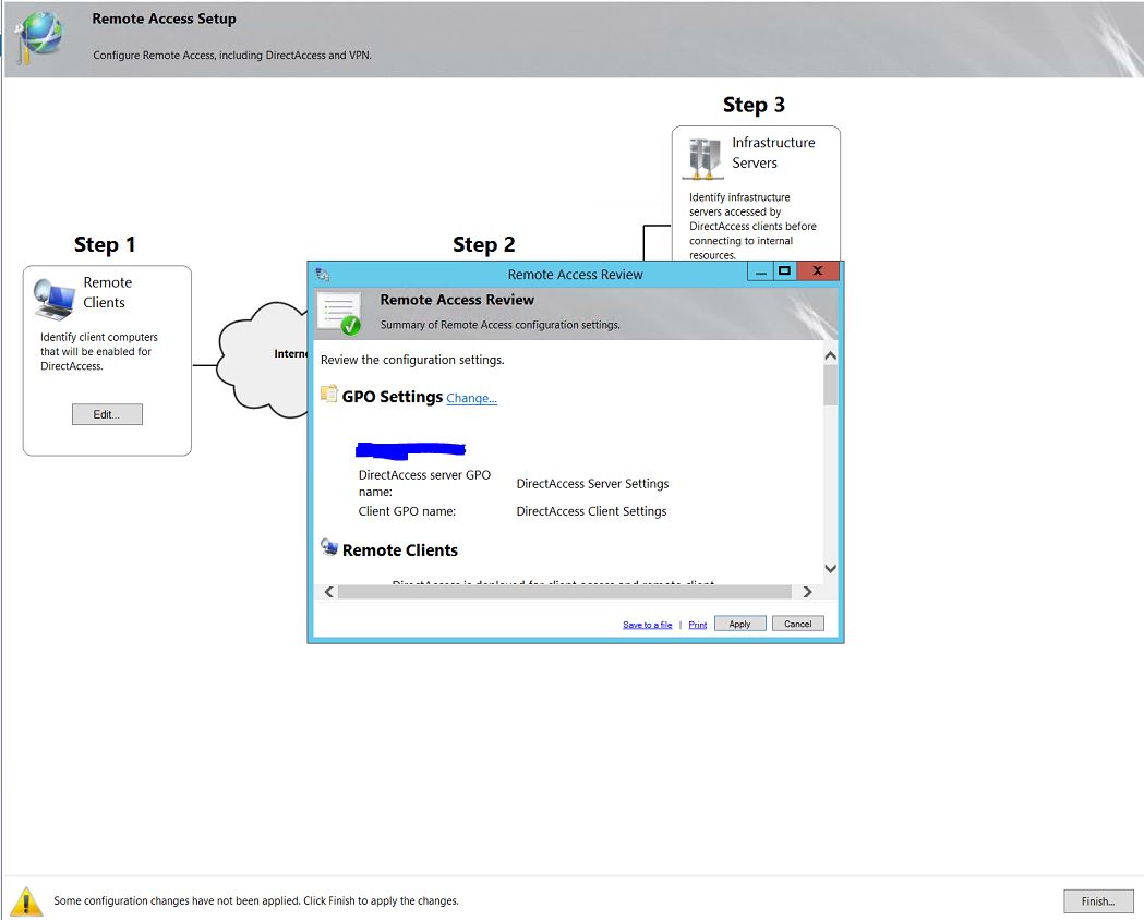 The wizard auto creates 2 key GPO policies , DirectAccess Server Settings and DirectAccess Client Settings . Restart the server after applying the settings. In the Remote Access deployment, configuring application servers is an optional task, so I chose to ignore the tasks in this step. The Operations Status page should look as shown in the screen shot after all tasks are completed. Any errors will be reported on this page: