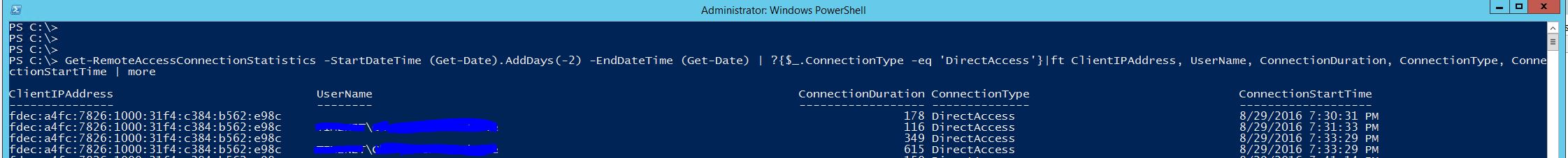 Get-RemoteAccessConnectionStatistics -StartDateTime (Get-Date).AddDays(-2) -EndDateTime (Get-Date) | ?{$_.ConnectionType -eq 'DirectAccess'}|ft ClientIPAddress, UserName, ConnectionDuration, ConnectionType, ConnectionStartTime