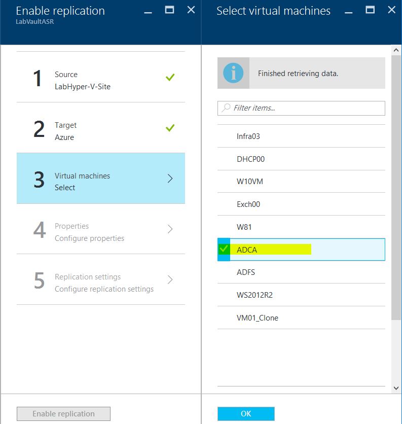 8) On the Enable Replication page, select the Source Hyper-V site and click Ok. On the Target page, select ensure that Azure is selected as the Target.Select the subscription. Select the Post-failover deployment model, in my deployment, I’ll be using the Azure Classic model. Select the Storage account. I want to Configure now for selected machines. And I also selected my already configure Azure Virtual Network.Click Ok.