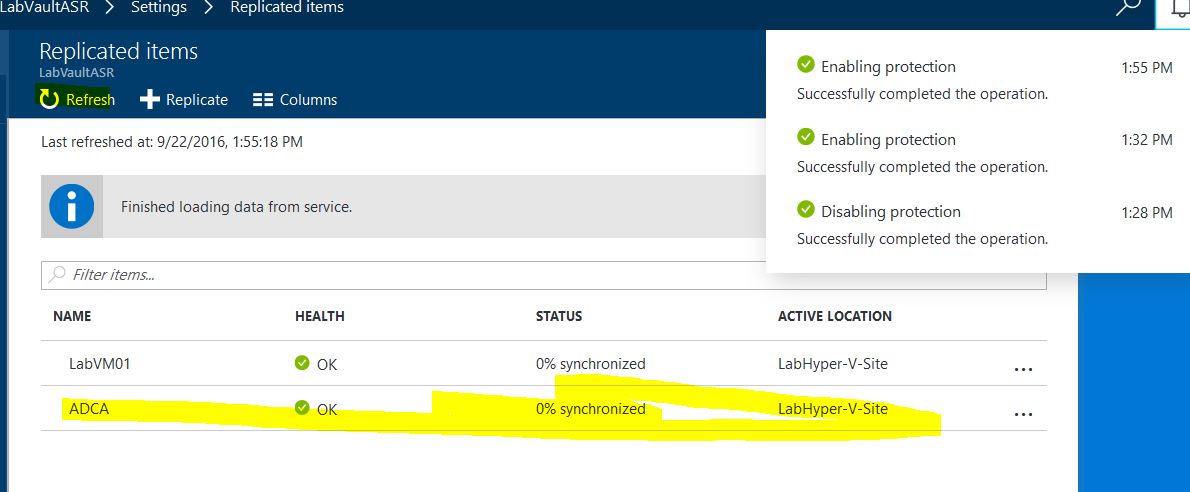 13) After successfully enabling protection of the VM, click the refresh button to display the newly protected VM on the Replicated Items page.
