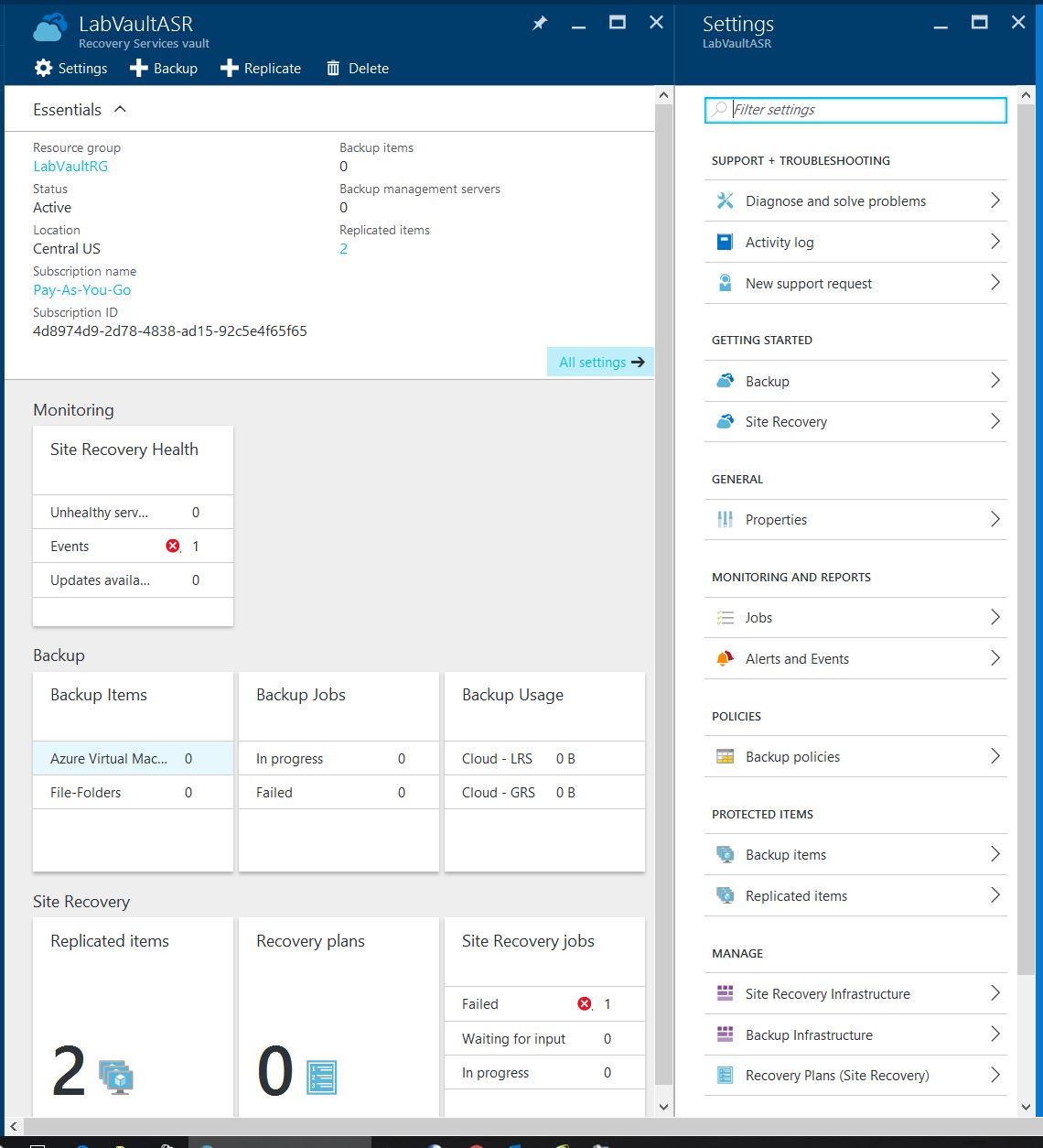 2) Under the default Dashboard, select All Resources and select the already existing Recovery Services Vault. My current vault is the LabVaultASR.