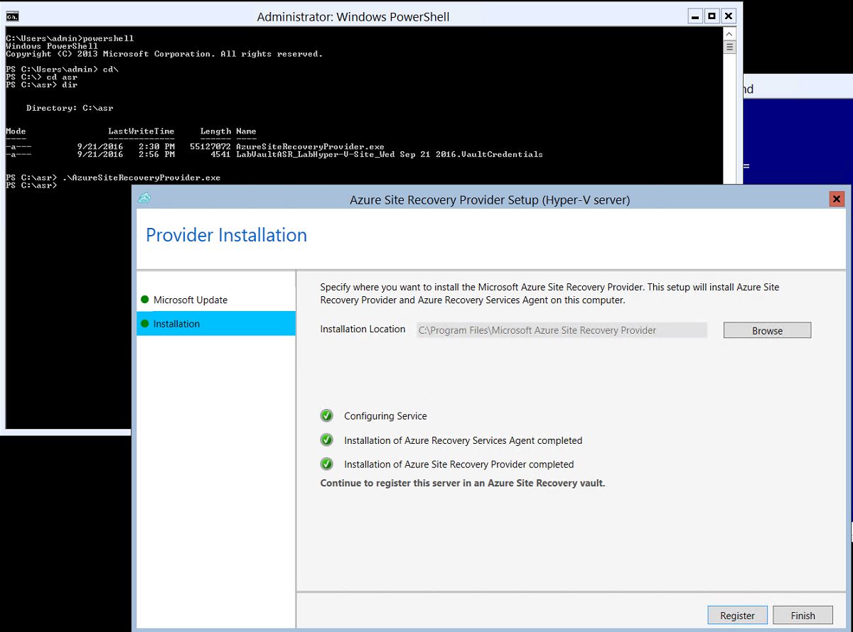 C:\Program Files\Microsoft Azure Site Recovery Provider>DRConfigurator.exe /r /friendlyname LAB00.MyAzureLab.net /Credentials "c:\ASR\LabVaultASR_LabHyper-V-Site_Wed Sep 21 2016.VaultCredentials"