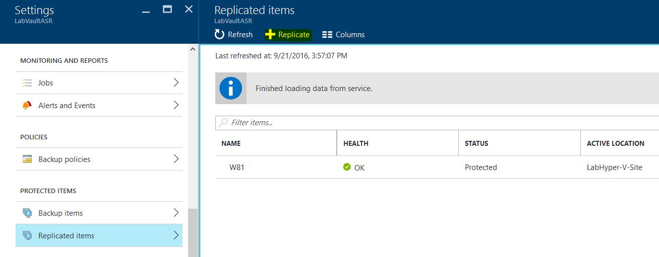 6) To configure and enable protection for Virtual Machines, navigate to the Recovery Services Vault(LabVaultASR in my deployment), Settings, Protected Items and select Replicated Items.