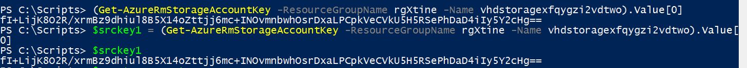 $srckey1 = (Get-AzureRmStorageAccountKey -ResourceGroupName rgXtine -Name vhdstoragexfqygzi2vdtwo).Value[0]