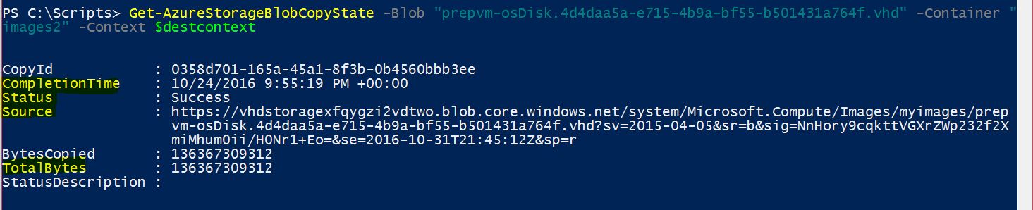 I can check the copy status by using the Get-AzureStorageBlobCopyState cmdlet. This cmdlet displays the status of the copy task, source blob, completion time and total bytes.