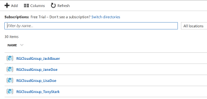 If there are currently no matching resource groups, the script creates resource groups for each of the Azure AD security group member. Each user’s resource group is named by appending the RGPrefix value with the MailNickName property of the user object. The resource groups are assigned initial tags. And the Owner role definition is assigned to the Azure AD user for the resource group. The following screen shot is an example of Resource Groups created after running the script:
