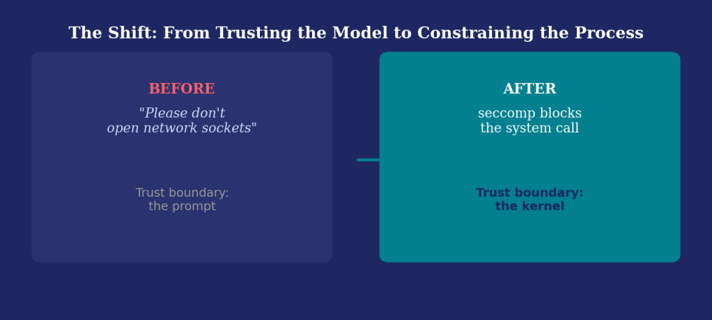 For the past three years, the dominant approach to making AI agents “safe” has been to tell the model what not to do: system prompts, content filters, output classifiers, guardrail frameworks. These operate at what I’ll call the suggestion layer: instructions to a probabilistic system that we hope it follows. The emerging pattern replaces hope with enforcement, moving the trust boundary from the prompt down to the operating system kernel.