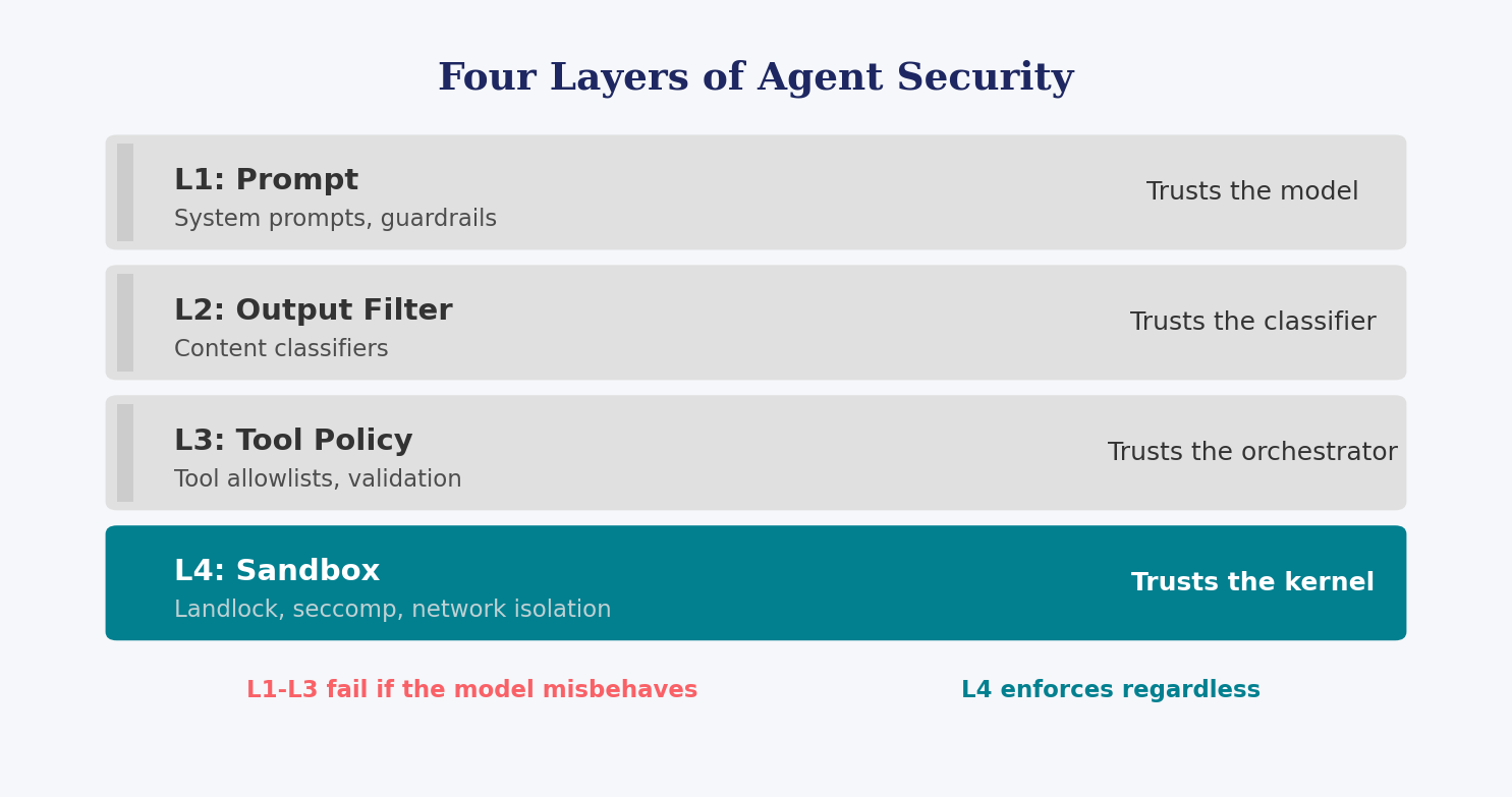 Layer 4 is different. seccomp doesn’t ask the model whether it intended to open a network socket. It blocks the system call at the kernel level, regardless of what the model thinks it’s doing. Landlock doesn’t negotiate filesystem access. It enforces it. The model’s intent is irrelevant.