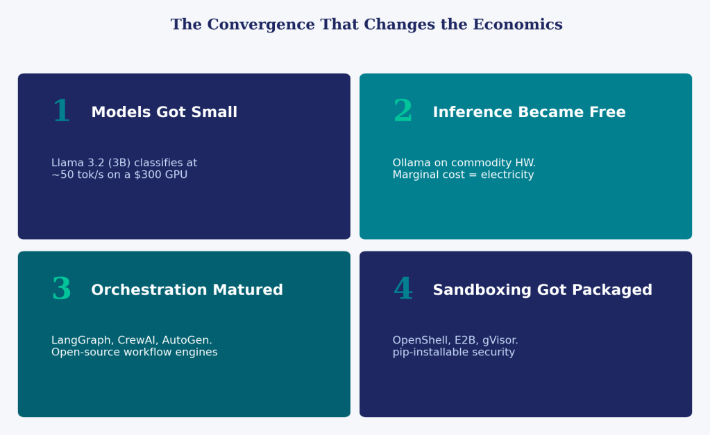 Here’s the argument in its starkest form: an accounting firm with fifteen employees can now run a document intelligence pipeline (classify invoices, extract line items, validate against purchase orders, flag anomalies) on a single workstation with a mid-range GPU. With a sandboxed runtime, they can let the agent execute code to generate reports and run calculations, safely contained. The total cost is hardware plus electricity.