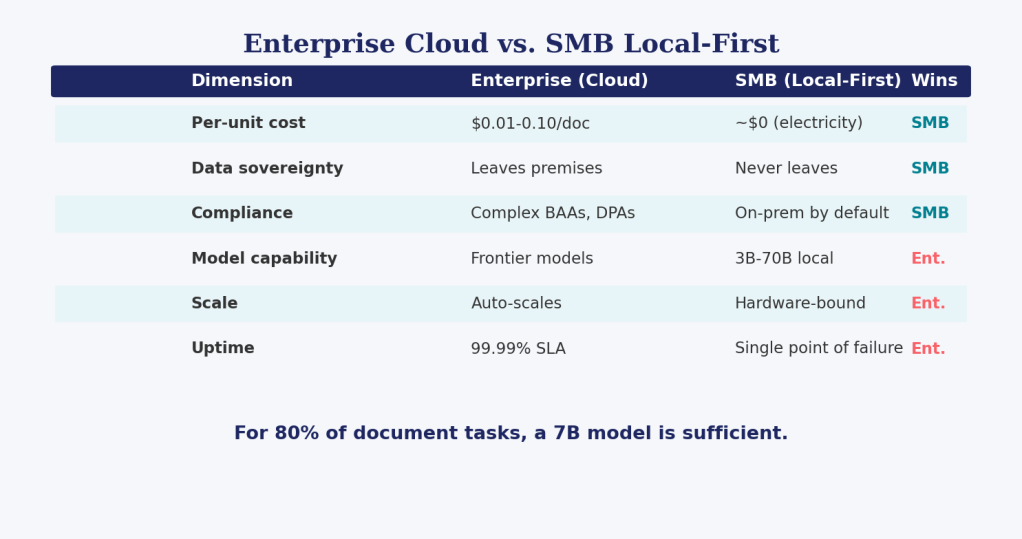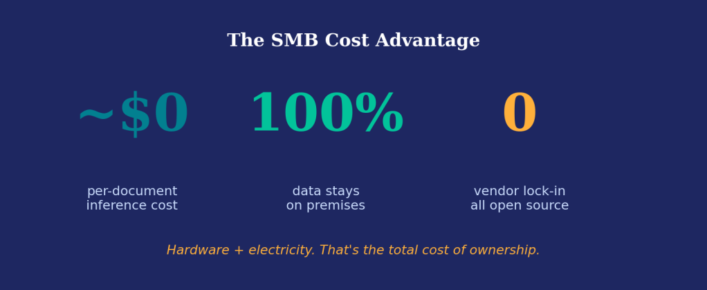 - Zero marginal inference cost eliminates the per-document fee that makes cloud AI prohibitive at scale for small businesses